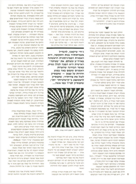 עם תחילת תעונה (סתיו 79) בסוהו, בניו־יורק נפתחת בגלרית נשים תערוכת ״שש אומניות מישראל״ שהתקבלת באהדה רבה; בעת שהציגו האמניות הישראליות בסוהו, הוצגה תערוכה של ״שבעה אמנים מישראל״ במוזיאון ברוקלין ולעומת תערוכת הנשים מישראל שהוצגה בסוהו, היתה זאת תערוכה תחת חסותו ואישורו של הממסד הישראלי האמנותי, אשר דאג, באמצעות ״שליחיו״ בניו־יורק (גלריה ברטה אורדנג) לכיסוי האירוע בירחון ה־״ארט פורום״. מנחם כשר שכתב את המאמר, סיים אותו בקובלנה נגד אפלייה לאומית מצד השלטונות האמריקאים כלפי הישראלים והתלונן שהאמנים ״נאלצו״ להציג במוזיאון שבברוקלין במקום להציג במוזיאון לאמנות חדישה, שבמנהטן. הילטון קרימר, של ה״ניו־יורק טיימס״ המבקר ה״ממסדי״ כתב ש״בישראל מציירים כמו במרכזים אחרים בעולם ושמצדו הציור הישראלי יכול היה להיות אותו הציור שנעשה בפאריס, לונדון או ניו־יורק״. אם אמנם אמנות היא א־מינית, כפי שטוענים, מדוע הוצגה אך ורק אמנות אשה אחת – האמנית הוותיקה, אנה טיכו?