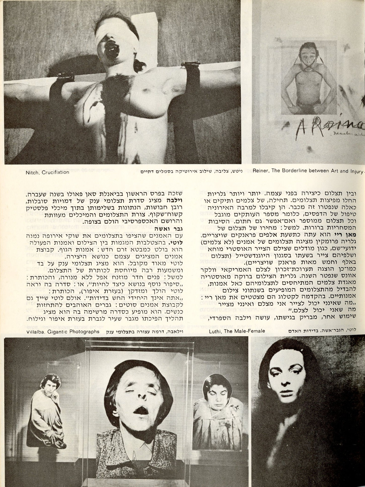 כורע לו אדם לבוש תחתונים וביריות אדומות עם גרבי משי, ולאט־לאט חותך במספרים את לבושו המצומצם. מטיל את מימיו לתוך כוס, ובגועל נפש מופגן לוגם ממנה עד תום. הוא ממשיך בחיתוכים – עכשיו בבשרך החי, חותך, דוקר ופוצע. על ראשו המגולח הוא חותך צלב ומכוון את קילוח הדם מקדקדו דרך גבו ועד רגליו. זו לא היתה תצוגה חיה, ביריד הוצג רק הסרט (כמובן ממוספר וחתום כפי שנחוץ). הצגה מזוכיסטית זו של גינטר ברוס היא רק אחת מסדרת הפעילויות האפיניות לזרם אמנות הפעולה (Action). לאבי האסכולה נחשב אוטו מילר, גרמני שהיה צייר לפני מלחמת העולם השניה. המלחמה על זרועותיה הביאה אותו לידי משבר, בעקבותיו השמיד את כל ציוריו המוקדמים והחל לעבוד בתצוגות עם אנשים חיים. הוא היה צובע אותם, מתיז עליהם, לוחץ אותם לבד ציור ושופך עליהם מיני דברי מאכל צבעוניים, אחר כך עבר לעשיית סרטים מתצוגות אלה, צבעוניים כמובן. בסרט מעורר מחלוקת הוא מציג עינויים אכזריים של אנשי .S.S באשה יהודיה, כולל התיחסות פרברטית נוראה אליה, כאל חיה. בסופו של הסרט מופיע אוטו מילר ככהן גדול, מביע חרטה ושופך על הדמות סמלי פוריות.