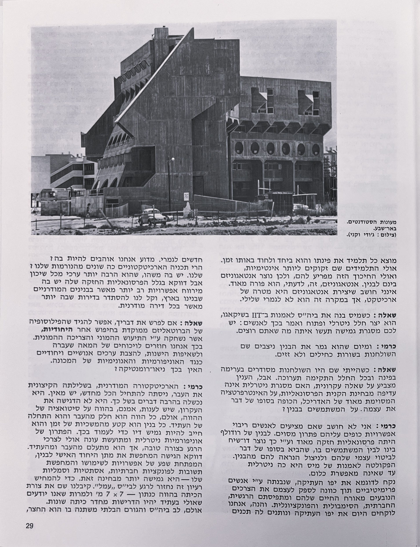 הארכיטקטורה משפיעה על איכות חיי היום-יום שלנו יותר מכל ענף אמנותי ותרבותי אחר, ועם זאת, נראה, שהמודעות לבנין ולרחוב כיישות אסתטית, אמנותית וסגנונית, היא דלה ביותר. לכן הלכתי לרמי כרמי – אחד הבולטים בארכיטקטים הצעירים בארץ, להבהיר מספר שאלות בתחומים אלה. רמי, בנו של הארכיטקט המנוח דב כרמי, יליד 1931, תל-אביב, סיים את "תיכון חדש" ושירת בנח"ל. למד שנה ארכיטקטורה בטכניון בחיפה והשלים את לימודיו בלונדון. החל עבודתו במשרדו של אביו, ובין הבניינים האחרונים שבנה ראוי להזכיר את ביה"ס עמלי והתחנה המרכזית החדשה בת"א, את מעון הסטודנטים בבאר-שבע ואת הפאקולטה למדעי הרוח בהר הצופים, בירושלים. כרמי הוא אחד המייצגים הבולטים בארץ לסיגנון הארכיטקטוני המכונה "ברוטאליזם". סממני ההיכר המובהקים של תפיסה זאת החלו להופיע באירופה בראשית שנות ה־50 ובין מניחי היסוד שלה אפשר למנות את הזוג סמיתסון באנגליה, את אלדו ואן אייק ואת לה קורבוזייה, בעבודותיו החל מראשית אותו עשור. הברוטאליזם היה מעין התמרדות בפוריזם ובגיאומטריזאציה המתומצתת של ה"אינטרנשיונל־סטייל" ומסורת הבאוהאוז, ששלטו באותו זמן. מספר היסטוריונים מנסים לקשור גישה זאת לתפיסות "ציוריות ברוטאליות" בנות התקופה, כגון אלה של ג'קסון פולוק ודיוביפה. קולטרמן רואה את הבנין ברוטאליסטי כנישלט ע"י קונצפט פיסולי והמדגיש את רב-ערכיותו של החלל, את החומריות ואת מיגוון התיפקודים האירגוניים והחברתיים.