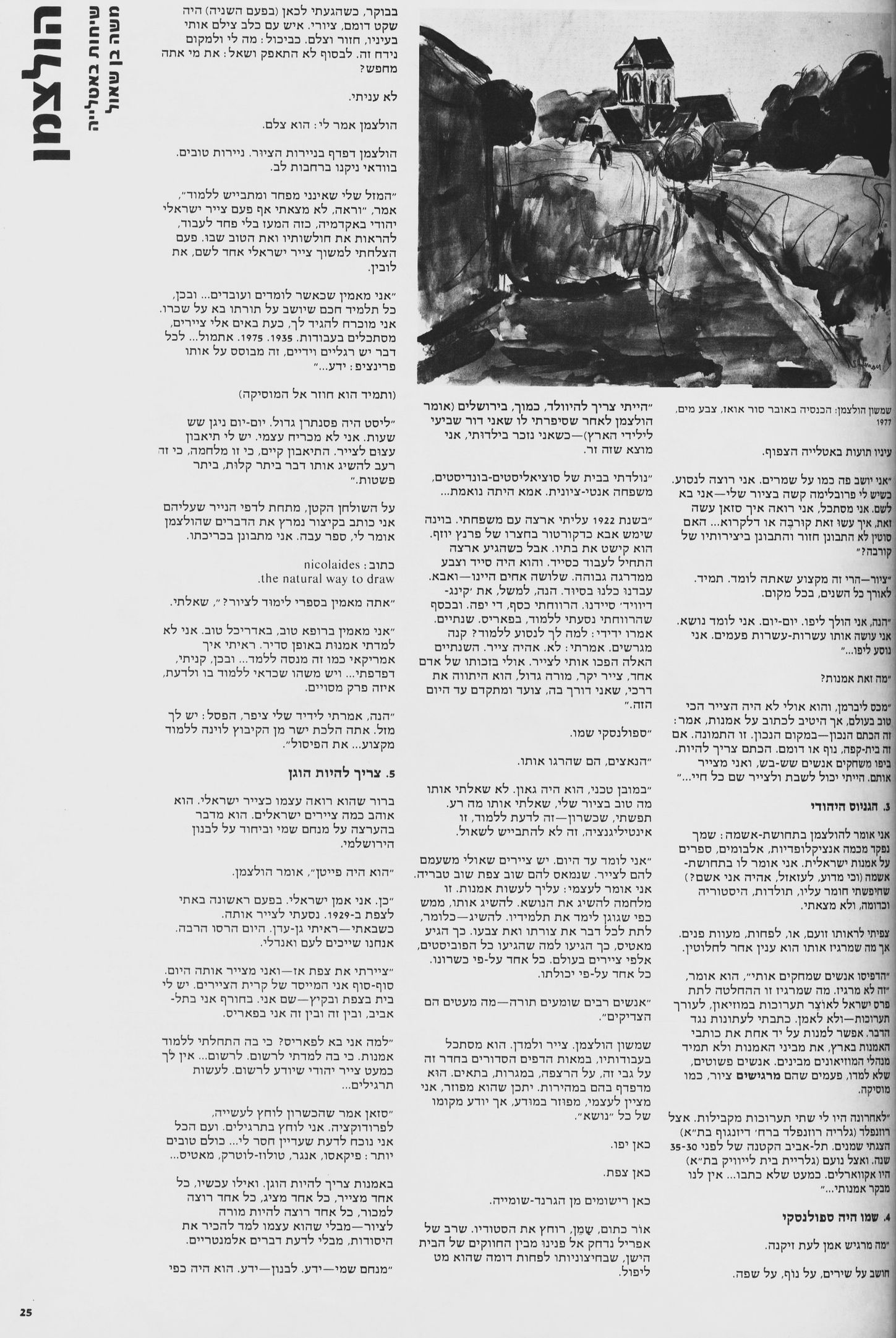 "הייתי צריך להיוולד, כמוך, בירושלים (אומר הולצמן לאחר שסיפרתי לו שאני דור שביעי לילידי הארץ) – כשאני נזכר בילדותי, אני מוצא שזה זר.