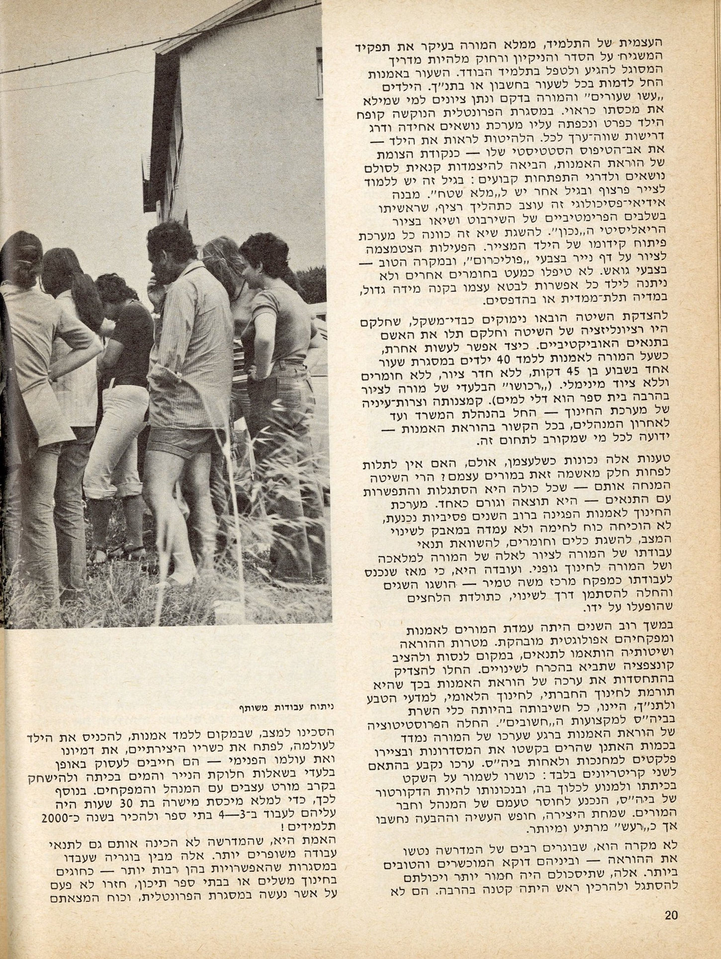 טענות אלה נכונות כשלעצמן, אולם, האם אין לתלות לפחות חלק מאשמה זאת במורים עצמם? הרי השיטה המנחה אותם – שכל כולה היא הסתגלות והתפשרות עם התנאים – היא תוצאה וגורם כאחד. מערכת החינוך לאמנות הפגינה ברוב השנים פסיביות נכנעת, לא הוכיחה כוח לחימה ולא עמדה במאבק לשינוי המצב, להשגת כלים וחומרים, להשוואת תנאי עבודתו של המורה לציור לאלה של המורה למלאכה ושל המורה לחינוך גופני. ועובדה היא, כי מאז שנכנס לעבודתו כמפקח מרכז משה טמיר —הושגו השגים והחלה להסתמן דרך לשינוי, כתולדת הלחצים שהופעלו על ידו.