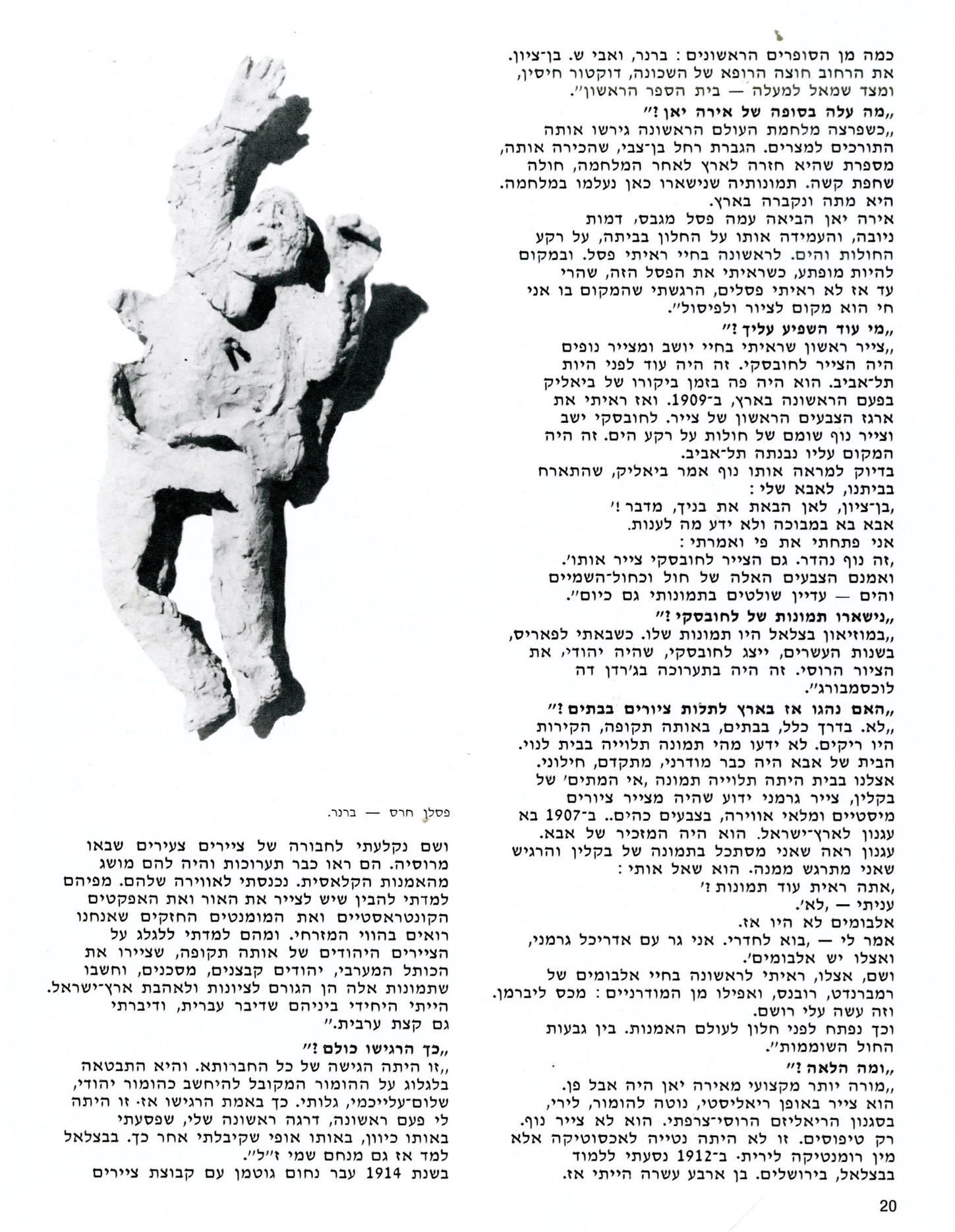 אירה יאן הביאה עמה פסל מגבס, דמות ניובה, והעמידה אותו על החלון בביתה, על רקע החולות והים. לראשונה בחיי ראיתי פסל. ובמקום להיות מופתע, כשראיתי את הפסל הזה, שהרי עד אז לא ראיתי פסלים, הרגשתי שהמקום בו אני חי הוא מקום לציור ולפיסול״.