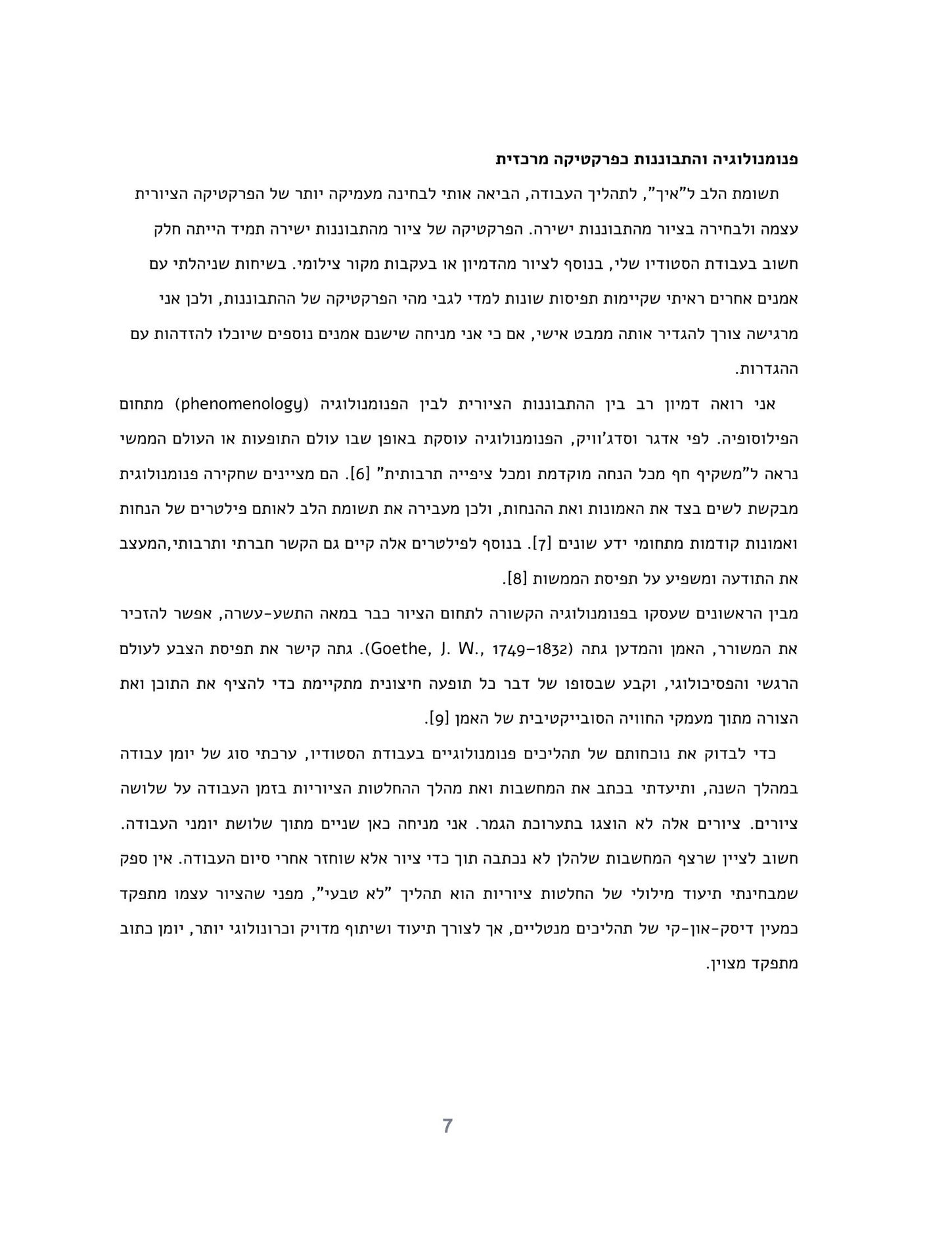 אני רואה דמיון רב בין ההתבוננות הציורית לבין הפנומנולוגיה (phenomenology) מתחום הפילוסופיה. לפי אדגר וסדג’וויק, הפנומנולוגיה עוסקת באופן שבו עולם התופעות או העולם הממשי נראה ל"משקיף חף מכל הנחה מוקדמת ומכל ציפייה תרבותית" [6]. הם מציינים שחקירה פנומנולוגית מבקשת לשים בצד את האמונות ואת ההנחות, ולכן מעבירה את תשומת הלב לאותם פילטרים של הנחות ואמונות קודמות מתחומי ידע שונים [7]. בנוסף לפילטרים אלה קיים גם הקשר חברתי ותרבותי,המעצב את התודעה ומשפיע על תפיסת הממשות [8].