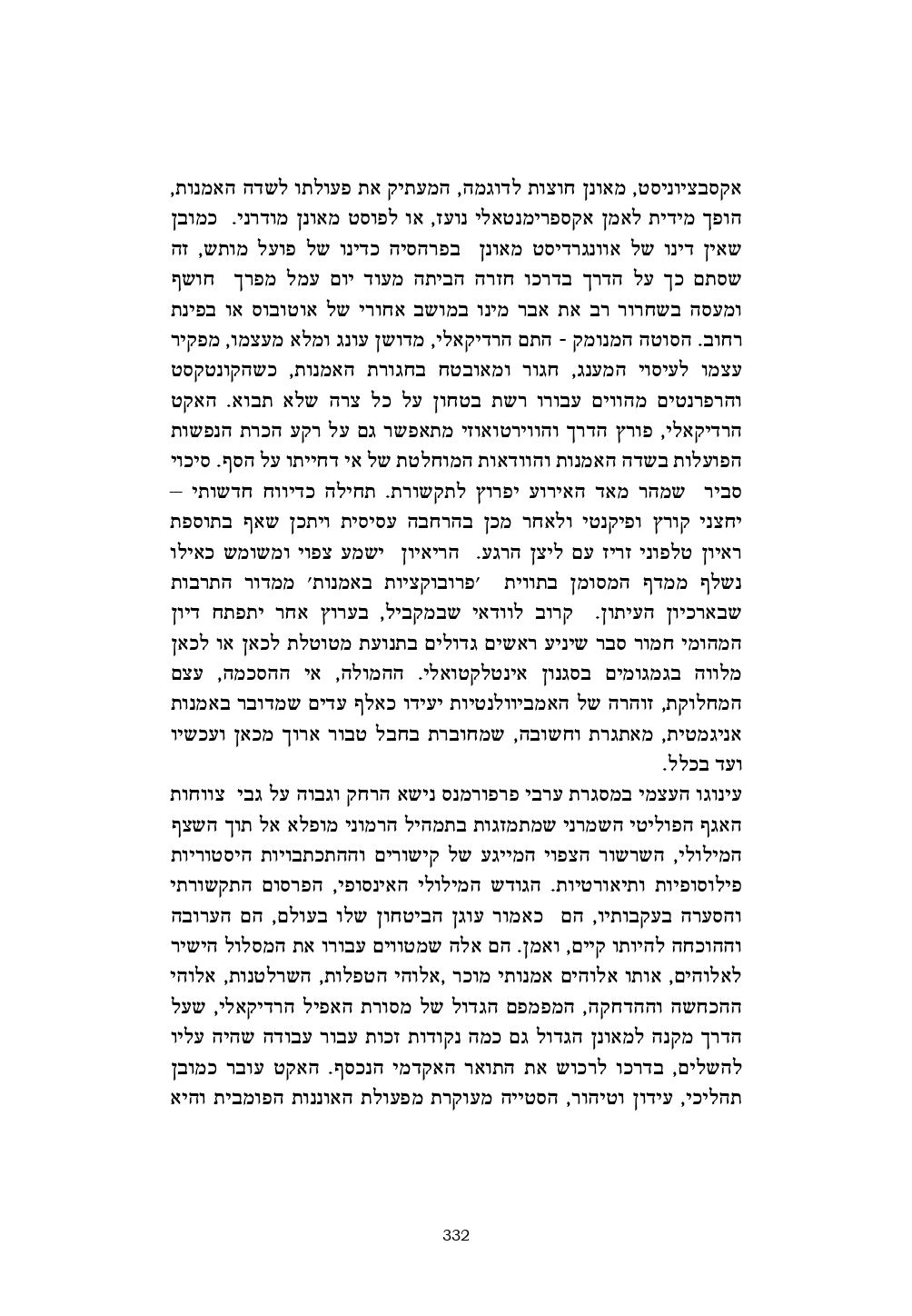עינוגו העצמי במסגרת ערבי פרפורמנס נישא הרחק וגבוה על גבי צווחות האגף הפוליטי השמרני שמתמזגות בתמהיל הרמוני מופלא אל תוך השצף המילולי, השרשור הצפוי המייגע של קישורים וההתכתבויות היסטוריות פילוסופיות ותיאורטיות. הגודש המילולי האינסופי, הפרסום התקשורתי והסערה בעקבותיו, הם כאמור עוגן הביטחון שלו בעולם, הם הערובה וההוכחה להיותו קיים, ואמן. הם אלה שמטווים עבורו את המסלול הישיר לאלוהים, אותו אלוהים אמנותי מוכר ,אלוהי הטפלות, השרלטנות, אלוהי ההכחשה וההדחקה, המפמפם הגדול של מסורת האפיל הרדיקאלי, שעל הדרך מקנה למאונן הגדול גם כמה נקודות זכות עבור עבודה שהיה עליו להשלים, בדרכו לרכוש את התואר האקדמי הנכסף. האקט עובר כמובן תהליכי, עידון וטיהור, הסטייה מעוקרת מפעולת האוננות הפומבית והיא הופכת לפעולה לגיטימית, חכמה, מדודה ושכלתנית. כלי עבודה ביקורתי, צינור קשיח להזרמת משמעות באמצעות ידיו המסוככות של האמן ולקרקע פורייה, מוכנה לעוד ועוד דישון וליטוש תבונתי, לעיבוד מלומד ומנומק מידי הפרשנים והלהגניים שמבין עיתונאי התרבות היומית.